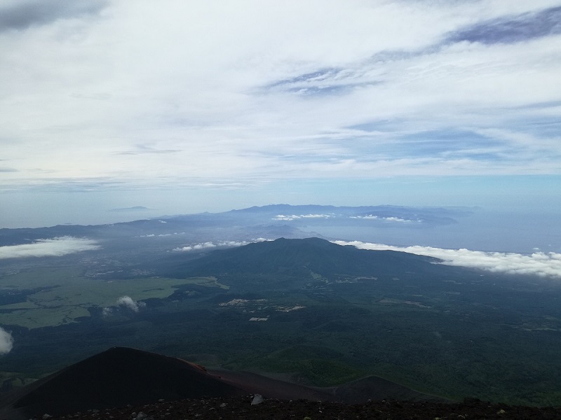 5区の後半から風が強く寒かった。前半は暑くて風吹かないかなと思っていたくらいだったのだが。7合目の砂走館(標高3090m)で終わりにしようか考えたが、少しだけ行ってみることにしてレインウェアの上着を着てスタート。5区まではまあまあ集中して歩きとおしたので疲労がたまっていて体も冷えているし早々にだめな感じだった。それでも赤岩8合で駅伝で走るときの5分遅れくらいだったのでもう少し行けるかもしれないと素通り。さらに標高が上がると風で巻き上げられた小さな石がときどき降り注ぐようになった。グローブを持ってきていなかったので手が冷たくなり感覚が鈍くなっていく。レインウェアの中に手を引っ込めるが区切りのいいところで引き返そうと思った。確か標高の書かれた案内板が出ていたはず・・・と思ったのだが、登山道が正式にオープンしていないためか案内板がまったくない。上のほうで登山道がまだ雪渓に埋まっている場所が一部あり解けかけた雪に埋まりながら、または雪の脇に登山道を外れて進む。ただ雪を避けて登山道を外れると自分が落石を発生させそうで危険だった。引き返そうと思っていた案内板はなく、どうしようか考えているうちに山頂まで行ってしまった。富士山に行くと決めたときは山頂まで行ってお鉢巡りを何周かしようと思っていたくらいだったが、長時間滞在するのは今日の自分のウエアでは無理だったのでさっさと下山。しかしグローブを持っていればもう少しきちんと登れたかもしれない。山頂で撮った写真は自分の指がボタンを押す感覚がないくらい冷えていた。