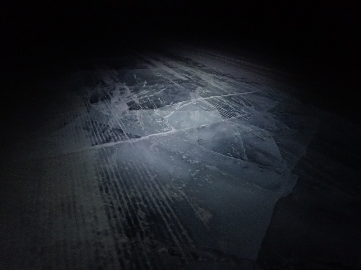 昼から夜への切り替わりはウェアを追加で着たり(DASパーカー、DASパンツを上に着る)、ソックスが湿っていれば履き替えたり、明るいうちにお湯を使う食事を済ませて必要な行動食を手元のバッグに補充したりやることが多い。手袋を外してまとめておこなうと手が冷え切ってしまうため、作業して行動して温めての繰り返しをしながら夜を迎える準備が整っていく。暗くなるとさすがに眠気が押し寄せてきた。頭の中も「次のCPはまだ見えないのか?」でいっぱいになってしまう。ふと足元を見ると建設現場か資材置き場のように金属のパイプとも角材とも見えるような長いものがごろごろと転がっている。なんでこんなものがあるんだ?とまたいで通行するが、しばらくしてこれは氷の下にあるものが浮かび上がって見えているのでは?と思い、またがずに踏みつけてみると平らな氷の感触。昼間は透明な氷にしか見えなかったのに夜になると川の中にあるものが浮かび上がって見えるなんて不思議だなーと写真を撮る(この写真をレポート書きながら確認してまたびっくり。普通のアイスロードが写っていて正体を見たと思っていたものもまだ幻覚だった)。細い木の枝に見えるものは氷のひび割れだった。