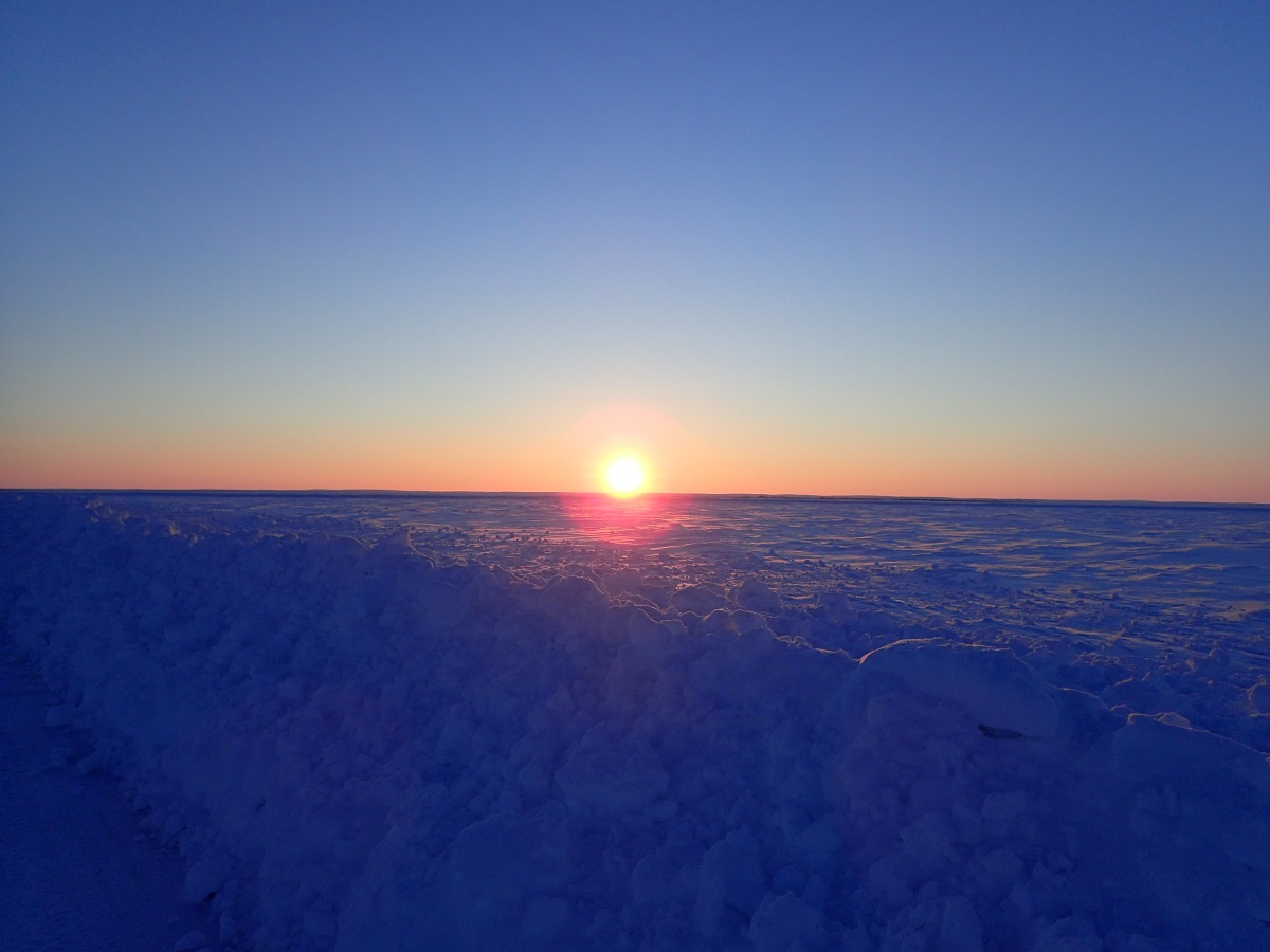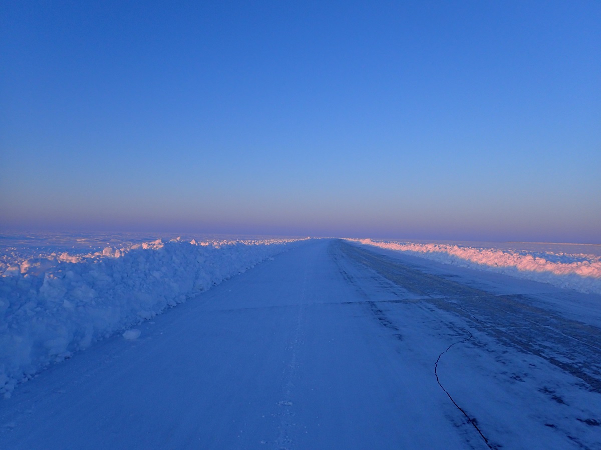 太陽が地平線すれすれになると雪原がピンク色になる。夜のうち、あと数時間でフィニッシュするためアイスロードを見るのはこれで最後(正確には帰りに車で同じ道を通るが)。ここまで見たかった景色を見てこれて本当に来てよかったなと思う。しかも来年からアイスロードはなくなってしまうという最後の年に全コースたどれたのは良かった。この景色がなくなってしまうのは寂しい。ピンク色の景色の中を進んでいるとドローンが飛んできて私を撮影している(笑)取材チームが近くにいるようだ。完全に日が沈んで最後の夜。制限時間的にも問題はなく午前4時くらいにタクトヤクタックにフィニッシュできるだろう。遠くに明らかに人工の明かりが見えるようになった。横一列に光が見えて左から右へ動いているように見えるのだが気のせいだろうか。橋の上を車の列が通行しているように見えている。街の明かりが見えたことで自然に急ぎ足になる。