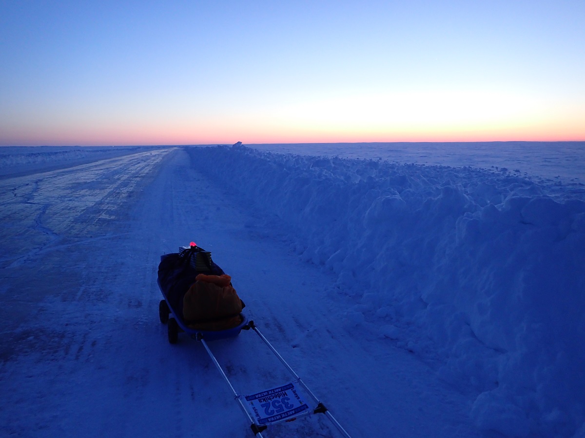 2度目の睡眠は明るくなってから道にカーブが現れ始めたところで除雪の壁がない広い路肩で寝る。真夜中はほとんど車(トレーラー)が来ないが明るくなると車が来るようになるため明るくなる前に寝る場所を決めれるとよかった。日中は変化に乏しい道をひたすら歩く。この区間は82kmといつもより10kmくらい長いので行動時間が2~3時間長くなる。きれいな夕日を見ながらカリブークリークの近くまできた。夕日といっても太陽が低い位置にあるだけでここからなかなか沈まないのだが。道の左側に大会スタッフっぽい車が止まっているが人はいなく建物もない。前のCPでは分岐でスタッフが待っていて「ついてこい」だったので、誰もいないということは違うのかもと思い先へ進む。先のほうにもキャンプ場っぽい看板が出ていたりする。