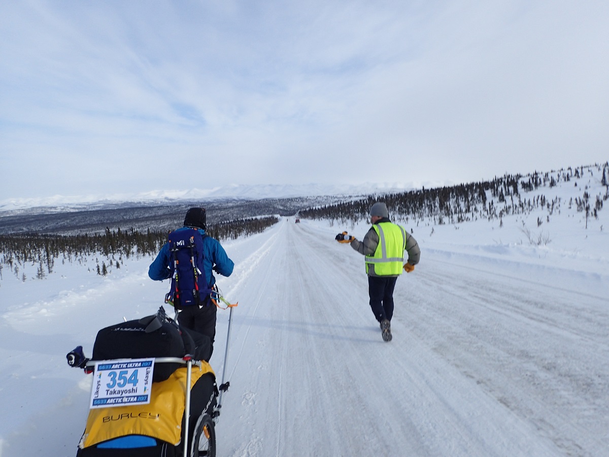 空にはうっすらオーロラが出ているのを見ながら再スタート。急坂を下り、V字に登ってその後はわりと平ら。3時間の停滞で自分の位置はどうなったか心配になる。順位狙いではないのだが最後尾になると主催者のチェックが厳しくなりそうな気がして最後尾だけにはなりたくない。後ろから大会スタッフの車が来て「あなたの友達を後ろに乗せているぞ」と後ろを指すので(英語がいまいちわかっていないこともあり)意味が分からず道路の後方を見る。すると車の後部座席の窓が開いて松村さんが乗っていた。「リタイア?」と聞くと「低体温症で回収されちゃった」とのこと。なんという打ち上げ花火・・・かける言葉が見つからず「がんばってくるわー」と声をかけた気がする。自分のほうはビバーク後のウエアで問題なくこのまま行けそう。