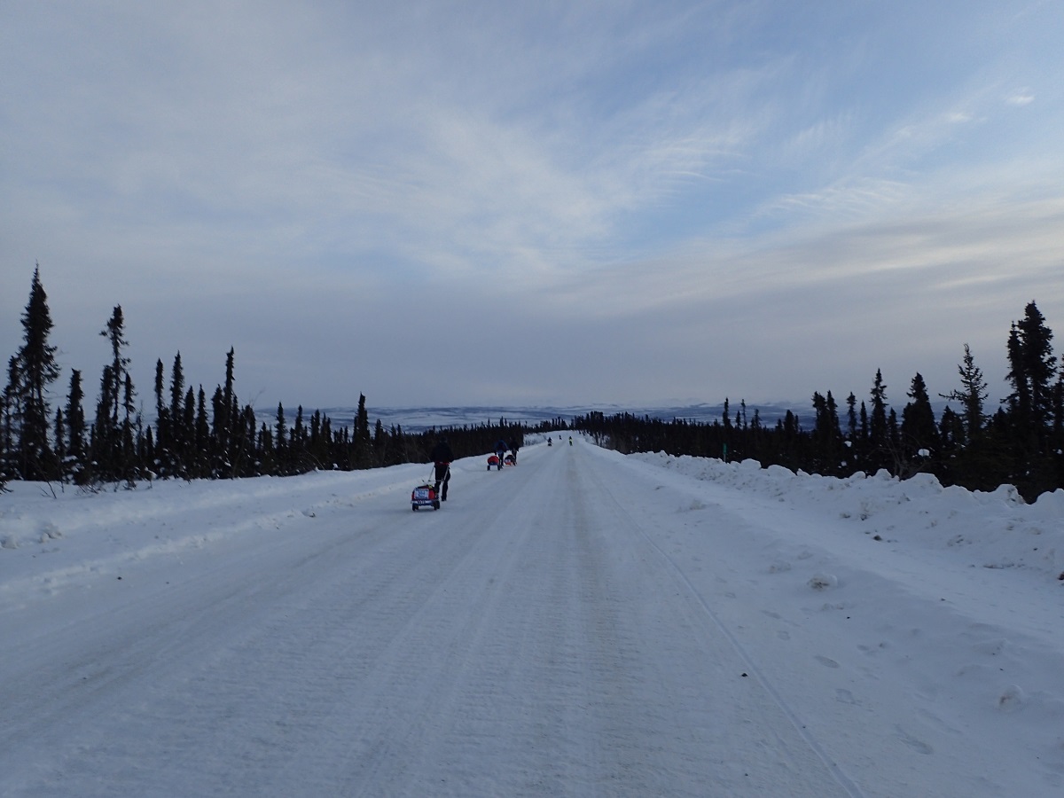 レースのフィニッシュ関門は8日後。ただしユーコン準州からノースウエスト準州に入るときに時差+1時間さらにサマータイムで+1時間されるため、実際には7日と22時間が制限時間になる。スタートするとまずは長い下り坂。トップに1人飛び出した選手がいて、それを追いかける松村さん。松村さんは撮影のためにトップを追いかけているのかと思ったら、どんどん突っ走ってトップ2人で視界から消えてしまった。こちらは急がずぼちぼちで。ただこの後に登り返しがくるので登りでがんばらなくていいように下りも特にペースを抑えることはしない。37kmのアークティックサークル(CP1)までは体力が有り余っている想定で時速6kmを予定している。そのためやや薄着でスタートしたがそれでもしっかり汗をかいている。気温はマイナス15度程度なので特別暖かいわけではないが。