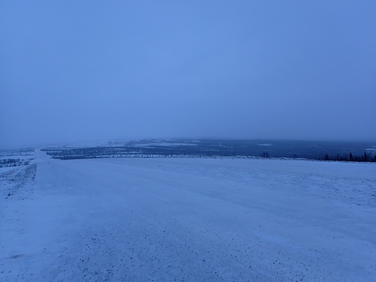 70kmを過ぎると明らかに今までとは異なる傾斜の坂が始まる。ボーダー越えに向けて本格的な登りの始まり。激坂を登って一段高いところに上がると傾斜は緩くなり周りに木がなくなった。風はほとんど吹いていないが、もしここで風が吹いたら大変なことになりそうだ。先を急ぎたい気持ちが強くなる。暗くて景色はほとんどわからないが山並みを見る感じかなりの絶景っぽい。定期的にやってくる眠気をなんとかやり過ごしながら「早く朝になれ!」と思う。うっすら明るくなってきたころ、後ろから速い選手に抜かされた。この選手にはCP1の前でも抜かされた気がする。姿は見なかったがどこで寝ていたんだろう。ただ速い人がいまここにいるということは自分も眠って問題ないのではと思い、少し進んだところにあった除雪車の転回跡で寝ていくことにした。