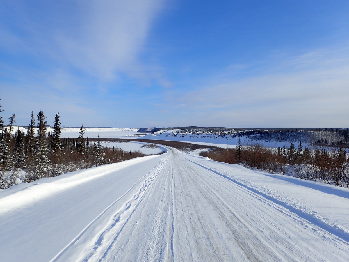 終盤はやっぱり足のむくみで痛い。やっとツィーゲーチックが見えてそこまでは下りなのに小走りすらできない。この先のことを考えると少し気が重くなってしまう。レース後半のアイスロードはある程度走れればという希望も持っているがこの痛み、この足の重さでは厳しい。マッケンジーリバーを渡るところで前の選手が迷っている。川の上をよくよく見ればツィーゲーチックを一度後ろに見るような方向に凍った川の上を進んでから右に曲がる道があるのに、そっちに行くとツィーゲーチックを通り過ぎてしまうと思っているらしい。思い切ってあと少し進めば看板も見えているのに。うまく説明できないので行動で示そうと選手を無視して進む。前にいた選手は通りすがりの車を捕まえてツィーゲーチックへの行き方を聞いている。そしてやっぱりこのまま川に進めばよいとのことだった。少し進んで分岐に来るとそこに大会スタッフの車がいてフォートマクファーソンのときと同様に後ろについてくるようにとのこと。ツィーゲーチックは小さな集落という感じ。こんな場所に人が住んでいるのが驚きで何を生活の糧にしているんだろう。家とかの見た目は普通だし教会があったり公園?(遊具のようなものが見えたが気のせいか?)があったりする。ツィーゲーチック到着14:35、予定より40分遅れ。