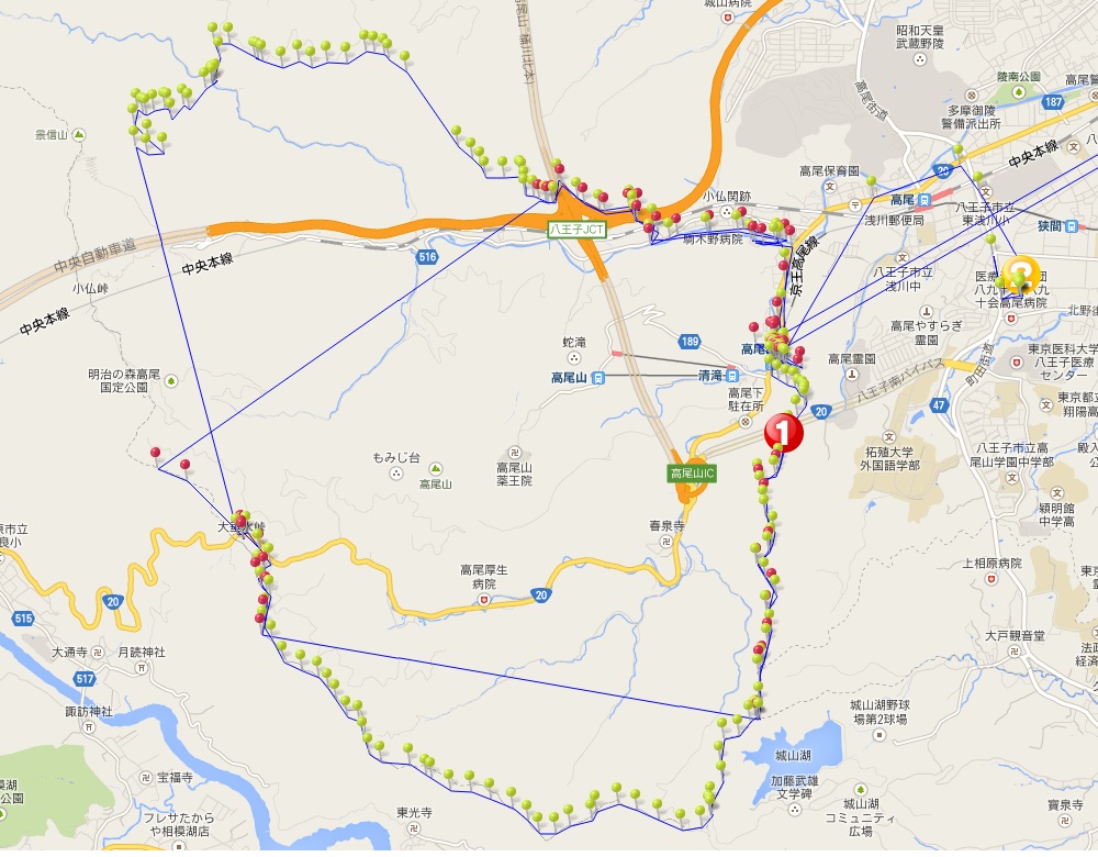 2号機(プラチナバンド)を最後尾に持っていただいた。ダメもとの1号機は自分が先頭で持つ。景信山から大垂水峠まではログが取れていないが他はまあまあ。ダメ元の1号機が思ったよりはがんばった感じか?草戸峠でコマンド送って目覚めさせた後は点々とログを発信しているので、草戸峠以前でコマンド送って刺激していたらどういう挙動をしたかが気になる。