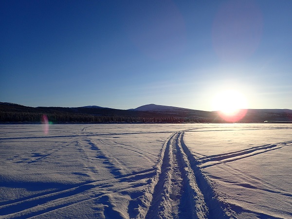 下見のときにホワイトホースからフィッシュレイクを目指したときに稜線からフィッシュレイクに下る道の分岐を見落としたので、トレイルがしっかりついているか心配だったが、普通にスノーモービルが通行しているトレイルがあり、まったく問題なかった。フィッシュレイクから標高差200mくらい登って稜線へ。稜線上は日が当たっているためか気温はマイナス10度くらいまで上がった。ここからホワイトホースの裏山トレイルの出口までは標高差500メートルくらいの下り。