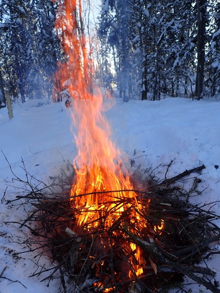 トレイルの出口近くに来たので焚き火の練習。自分の中で川に落ちた後急いで大きな焚き火を作り体を乾かさなければいけないというシナリオ。周囲は丈の低い木が多く雪をかぶっているので燃料になる木を集めるのが難しそうだったが、トラブルの場合には場所を選んでいられないため、そこで実施。燃料不足で大きな火にはできなくても、集めた木が燃え切るくらいの焚き火になればと思ったが、着火剤の周辺をわずかに焼いたくらいで消えてしまう。落水後というシナリオで言えば「はい、死んだ!」という感じ。下見のときのガソリンストーブ凍結に続く2回目の死亡。気温はマイナス27度まで低下。山の上が一番暖かかった。