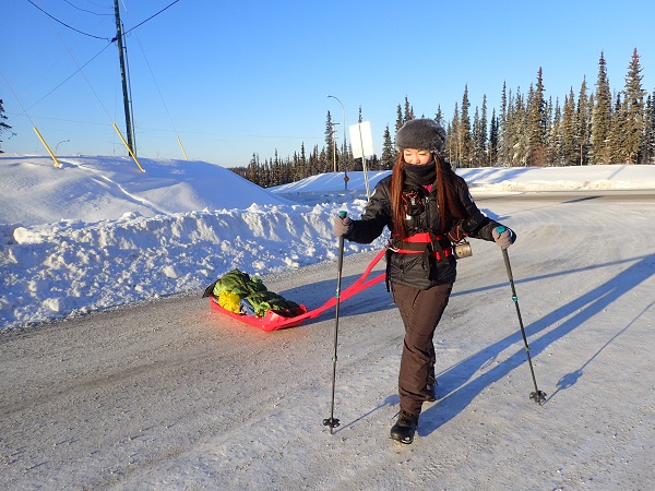 昼食後にソリへの荷物搭載。レース中最も荷物が多くなるペリーファームからドーソンまでの装備。食事5日分というのが大きい。しかしソリを引いてみると意外と軽く感じた。れなっちもソリ体験。意外と軽いというのは同じ感想。気温はマイナス24度だったが、確かにマイナス30度と比べて楽で、マイナス30度が何かしようと思うか、思わないかの境目だと理解してくれた。