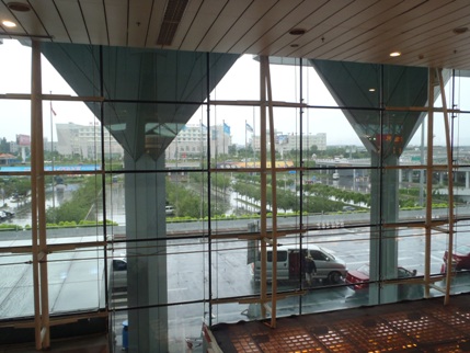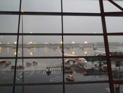 飛行機の遅れは大雨のせいのようで飛行場にはどんどん離陸できない飛行機がたまっていく。時々着陸してくる飛行機は水しぶきを上げて滑走路を走っていく。17時前には外は暗くなってしまい「もう夜?」と思ったが、そんなわけはなく真っ黒な雲に覆われてしまったようだ。この日北京では10年に一度の大雨で洪水になり車が流されたりして大変だったらしい。
