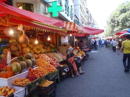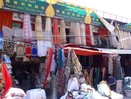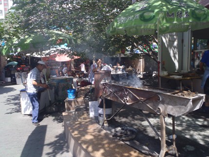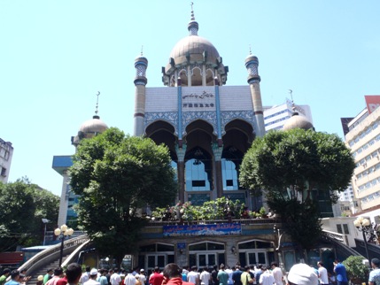 ほんとうに普通に都会なだけなので、早めにホテルに戻ることにし戻りかけたが、長谷川さんが市場とかもう少し面白いものを探したいとのこと。確かに何の収穫もないまま戻るのは残念なのでガイドブックを見てウイグル族が多く住んでいるという地区を目指して歩く。繁華街の中心部を離れるとだんだん書かれている文字が中国語からアラビア語に変わってきた。さらに進むとモスク(イスラム寺院)を発見。その周辺はエジプトに行った時に感じた雰囲気そのもの。もう中国という感じではないのだがこういうほうが面白い。小野さんと長谷川さんもテンションが上がるツボが同じらしく怪しい路地を見つけては入りこんでいく。路地に入れば入るほど中国語は消えてアラビア語に。