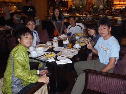 夕食に集合する。栗原くん、鈴木くんも到着して、あとは美絵さんだけ。北京空港の乗り換えが昨日の大雨の影響でまだ混乱しているのかもしれない。外に食べに行くほどの元気はなくホテル内のレストランで夕食にすることにした。高級そうなレストランばかりでメニューを見せてもらっても「高いなあ」という感じなのでけっきょく喫茶店に併設されたリーズナブルなレストランで食べることにした。ビュッフェで好きなものを取って食べる。朝食もここだったので同じようなものが多くしかも特においしいわけでもないという・・・まあまずくはありませんが。いつもレーシング・ザ・プラネットのレースで使うホテルは現地の高級ホテルで食事はとても美味しい印象があっただけにそれに比べるとちょっと残念な感じだった。このホテルもここでは高級ホテルだと思いますが。