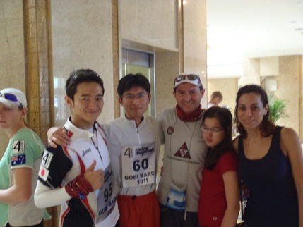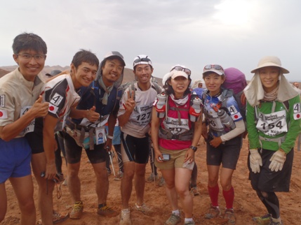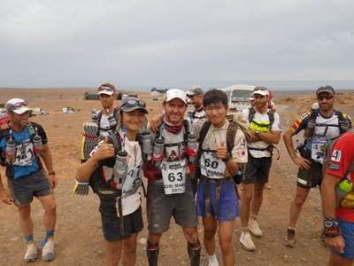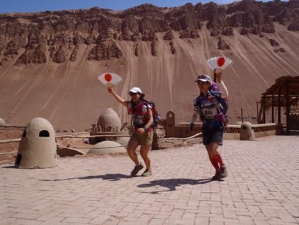 いつものようにゴールには飲み物・食べ物がたくさん。ジュースがうまい!(笑)しかし今回お腹の調子はいまいちなのか固形物に対する食欲がなくフルーツばかり食べる。ゴールまであと少しのところに座って飲み食いしながらみんなのゴールを待つ。みんなのゴールシーンは心温まる雰囲気。この雰囲気をいかに伝えるかというのは難しいというか不可能な気がする。これを感じたければここに来るしかないんだろうな。今日は上位でゴールしたジミーがぐったり横になっていた。握手して写真を撮ってもらったがジミーはかなり具合悪そう。この後ジミーはバスで帰らずスタッフの車に収容されたようだが・・・ジミー速いのにデリケート過ぎるぞ・・・。アリがゴールにやってきたので小野さんと一緒にゴールゲートへアリを迎えに行く。アリは奥さん娘さんに出迎えてもらってとても嬉しそう。アリは次は南極レースに挑戦する予定。南極で再会できるといいな。それからさらにだいぶ時間がたって美絵さん、長谷川さんが一緒にゴールへやってくる。2人で日の丸が書かれた扇子を掲げてゴール!すばらしい演出、やりますなー。