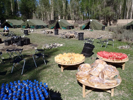 まだレーススタート前なので、前日の夕食は自分で用意していくことになっているものの、大会側からペプシ、パン、スイカ、メロンの差し入れがあった。パンは重量感がありちょっと固くておいしいとは言いがたかったけどなんとか食べきった。レース前なのでエネルギーを体に溜め込みたい。韓国から今回は大所帯で、タッパーにたくさんの韓国料理を用意して大宴会に。ウルムチに住んでいる韓国の方からの差し入れらしい。「たくさんあるので一緒に食べよう」と誘ってくれ韓国・日本メンバーで楽しい食事の時間になった。韓国の人は日本語ができる人が多いみたい。以前から知り合いのユーさんはまったく会話に支障ないし、今回初対面のキムさんも日本語がすごく上手。キムさんはヒマラヤによく行く登山家で山の話をしてくれた。