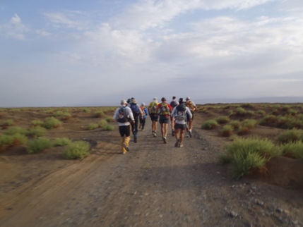 速歩きしながら水と塩タブレットを繰り返し摂る。手が浮腫んでいるので手を握ったり開いたりして血行を良くする。しばらく進むと塩タブレットがない!ザックのポケットから出し入れしていたのだが落としてしまったらしい。こまめに摂っていたので、落とした場所からそんなに離れてはいないはずと思い後ろを振り返る。だいたい自分が歩いてきた場所はわかる気がする。しかし真っ平らな地面というわけでもなく塩タブレットの袋を見つけられるかどうかと考えるとちょっと自信がない。客観的に判断すれば不可能に近いのかもしれない。少しどうするか考えたが「とりあえず今日だけでもなんとかゴールにつければ後は明日のロングコースのみ。みんなから少しずつ塩を分けてもらえば1日分くらいはすぐ集まるだろう」と考え先へ進むことに。最悪コーンスープの粉でも舐めて進めばなんとかなるだろう。