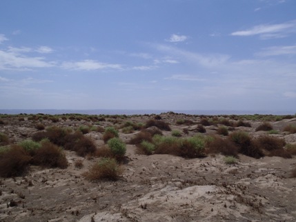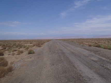 小野さんが走って行った道は車が普通に走れるくらいの土の道。もし追いつけなければ本当にコーンスープでもカップラーメンでも塩分のあるものを口に含みながら進むしかなくなってしまう。幸い現時点では塩分も水も足りているらしく手の浮腫みもすっかり回復している。「仕方ない一か八か全力で追いかけるか!」と判断。追いついて塩タブレットでもスポーツドリンクの粉でも分けてもらえればそこから先は時間をかけてゆっくり進んでもいい。土の道を全力で走る。しばらく進むと再び荒地になったが前方に歩いている小野さんを確認。「そのまま歩いていてくれ!」と願いながらやっと追いつくことができた。