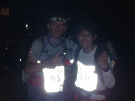 満天の星空の下を2人で走る。アリは左足が痛むらしくときどき「ああっ」っと痛そうな声を上げるが「ゆっくりでいいよ」と言っても「問題ない」と追い込み体勢(こちらもきついです)。アリはすごい気迫。よく考えれば病気の娘さんに勇気を与えるために走っているのだから何があっても心が折れるわけがない。NHKのアタカマ砂漠番組では弱々しいところばかり映っていたが素晴らしいランナーじゃないか。時々歩いても走りやすそうになると、アリはすぐに「kabasawa OK?(走ってもOK?)」と言う。こちらの返事は常に「OK」とことん付き合ってやる。暗闇の中CP7に到着。真っ暗になるとコースロストの危険が増えるためCPでバディ(複数人のグループ)で行けと指示が出ることがある。自分とアリはすでにバディ状態になっているのでもちろん問題なし。バディを組めていない場合は後ろから来る選手を待たなければいけない。