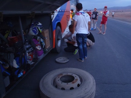 バスは山道を下っていく。遠くの方に街の明かりが見えるがあれがトルファンだろうか。山道を下り切ると高速道路のような道に入りバスはスピードを上げていく。しばらくうとうと眠っているとバスが停止。トイレ休憩か?と思ったがどうも様子がおかしい。外に出てみると自分の乗っている3号車がタイヤ交換中。何かトラブルがあったようだ。今までの4Desertsのレースでは、エジプトではバスのエンジンが煙を吐いて動かなくなり、アタカマではバスが川にはまったのをみんなで押して脱出し、とバスで必ずトラブルが起きている。「またかー(笑)」とタイヤを交換する様子を写真に撮って楽しむ。かなり長い時間かかってタイヤ交換が終了し再び移動開始。