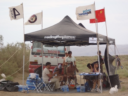 自分のテントに帰り横になって「今日はもしかしたら日本人参加者からもリタイアが出るかもしれない」と思っていると長谷川さんが帰って来た。「ありえ~ん・・・」と倒れこみぐったりしている。あまりの暑さで各CPでは待機・休憩者続出、コース上で行き倒れている人も続出だったらしい。キャンプ地にもだいぶ選手は帰ってきていたがゴールテントが拡張されて野戦病院のように人が倒れている。そんな中、隣のテントから「ちょー簡単だったー♪」と成宮さんの声が聞こえてきた。無事に帰って来たらしいが・・・簡単だった?そんなわけないだろうが、冗談でも元気にそんなことを言えてしまうのが恐ろしい。さすがリタイアするする詐欺だ(毎日のように今日はリタイアすると言っている)。