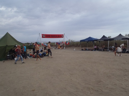 10kmほどの砂丘を越えてようやくチェックポイントへ。砂がシューズに入るのを防ぐゲーターはつけていたものの1時間半ほど砂丘を走るとシューズの中には砂がたくさん入る。CP1でシューズと靴下を脱ぎ砂をしっかり落とす。このとき靴下も脱ぐのがポイント。砂はみんな靴下の中に入り足にまとわりついているのでシューズを脱いだだけだとほとんど砂は落ちない。指先の皮膚が少し剥けていたためバンドエイドを貼っておく。この間に何人かがCP1を通過。その中に小野さんもいた。水を持ってきてくれたスタッフが、ザックの背中に付けてある寄せ書きラミネート加工を見て「おー」と言っているので「友達からのメッセージなんだー」と自慢しておいた(なんて言ったら英語で自慢したことになるかわからないが雰囲気でw)。