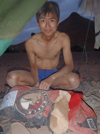 成宮さんは、あまりにのんびりした人柄でとても楽しいです。「明日から何が始まるのかわかっているのか?」と思いながら話をしていましたが、そういえば成宮さんはすでにサハラマラソンを完走しているのでした。サハラでは血を吐きながらゴールを目指しなんとか完走したそうです。話す口調からは想像もつかないような強靭な精神力を持っているようです。サハラをゴールしたときには達成感も何もなかったそうでそのためもう一度リベンジ?に来たようです・・・が、すでに日本に帰りたいとかリタイアしますとか言っています。食事をしていると韓国のユーさん登場。「久しぶりー!」と握手。ユーさんとは東京での飲み会とエジプトのサハラレースで会っている。サハラレースのときはリタイア寸前に治療をしてもらったりお世話になっている。「調子はどう?」と聞かれ「いい感じ」と言うと「でも心配(笑)」と返された。今回はユーさんと再会しテントメイトでもあるので楽しくなりそうだ。
