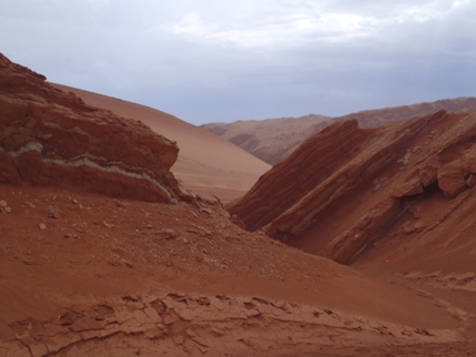 CP2に到着してようやく小野さんと言葉を交わす。自分の後ろに付くことでいいペースでこれたとのこと。CP2を歩いて出発。少し食べ物を食べてからゆっくり走り始めるがどうも胃がむかむかする。向かい風が強くなってきたこともあって少し落ち着くまで歩くことにする。小野さんもあまり調子が良くないらしく2人で話ながら歩く。風に少し雨も交じって涼しく感じる。このまま涼しいといいんだけどなーと消極的なことを考えてみたりする。しばし暑さが和らぎ景色を見ながら気持ちよく歩く。この区間はコース説明に「salt flats」と書いてある。これはアタカマ塩湖の修行コースと同じ。しかしこちらは塩の大地の中に車が走れるくらいの道があって、そこを進めばよいので楽なコース。コース難易度も「Easy」と記載されている。「Easy」で涼しいこの状況で走らず歩いているのはちょっともったいないなと感じたが胃のむかつきがなくなるまではゆっくり行ったほうがよいと判断。通常ロングステージは少しくらい無理しても時間の早い涼しいうちに距離を稼いでしまったほうがよいのだが・・・(過ぎてみれば間違った判断だったように思える)。