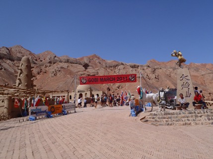 コースは緩やかな登りが続き、順位が決まっていること、前後に上位の選手が見当たらないことから若干ペース落ち気味。時々抜かす下位の選手と声を掛け合いながら走っていく。そろそろ成宮さん、栗原くんあたりに追いつかないかなーと思うが日本人選手には追いつかない。さすがに14kmで1時間差は厳しいか。最後にがつっと登った後ゴールに向かって下り。スタッフに「あと2km」と声を掛けられる。下りを爆走していると成宮さん発見。さらに下って岩の角を曲がるとラクダが!(野良ではない)崖の隙間でコースが狭いので刺激して蹴られたりしないようにそっと横を通り抜ける。崖の隙間を抜けるとなにやら建物が見える。ゴールだ!舗装路に出る手前で鈴木くんを抜かす。少し舗装路を走り建物が立ち並んでいる敷地に入る。そしてゴール。ずっしり重い完走メダルをかけてもらう。ゴビ完走も嬉しいが、ついに南極レースへの扉が開かれた!栗原くんが「おめでとうございます!」と出迎えてくれた。この場所は火焔山というところで西遊記の舞台でもある。孫悟空の像があり、この場所は中国西部の砂漠地帯でも特に暑い地域らしく案内看板に「中国最熱的地方」と書かれている。