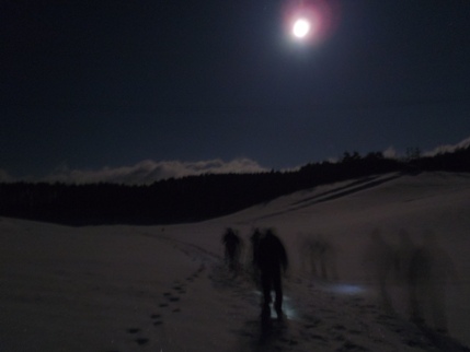月明かりの中、スノーシューハイキング。満月が明るくヘッドライトを使う必要はありませんでした。あまりに神秘的、あまりに静か・・・。(場所:長野県大町市中山高原)
