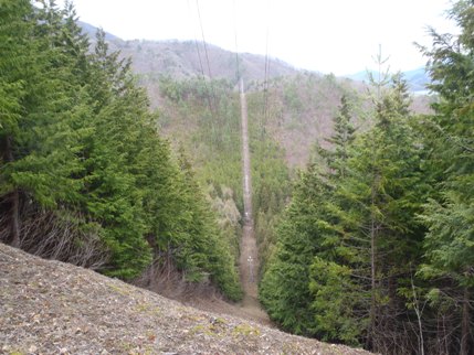 送電線は木崎湖から青木湖手前の中綱湖まで一直線に尾根を3つ越えていく。普通の登山道や作業道などは歩きやすいようにラインが付いているのだが、ここは完全に一直線。ジェットコースターのように一気に登り一気に下る。東側の下の方に見えている国道を通ればすぐなのだが(笑)普段ではあり得ないようなアップダウンが終わってみればなかなか楽しかった。