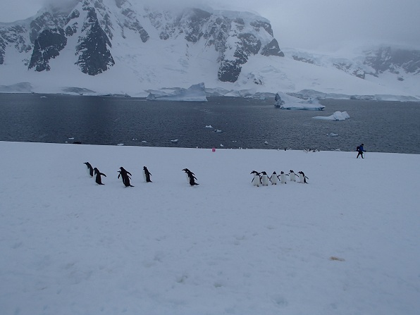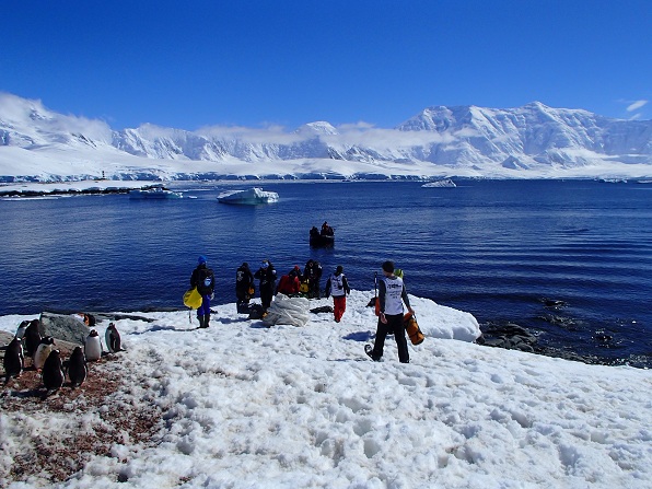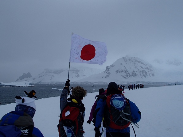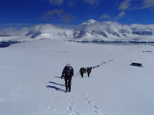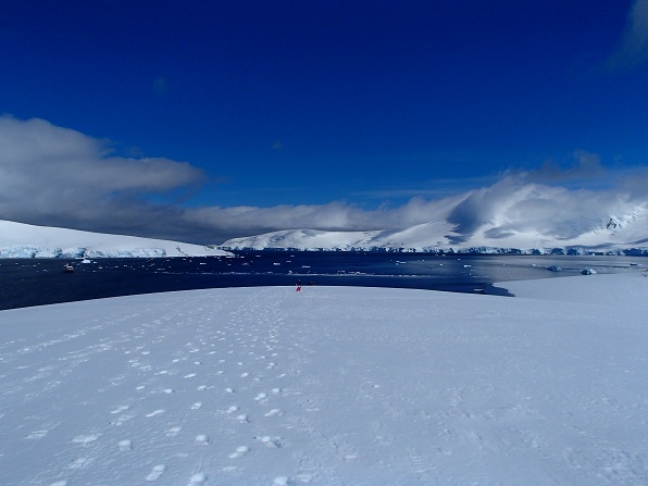 天候は晴れ。空と海の青、陸地と山の白がまぶしい。南極できれいに晴れる日は少なく貴重らしいのだが、今回の自分たちはかなりラッキーなのか。昨日はレースは中止になったものの晴れている中で上陸できたし1日中天気が悪いということがない。上陸したら踏み後をたどってベースキャンプへ向かうように指示されたが踏み後は緩やかな斜面をずっと登っていき丘の向こうに消えている。ゾディアックを着けた海岸からけっこう離れていそうだ。景色が抜群にいいので写真を撮りながらのんびり歩いて行く。