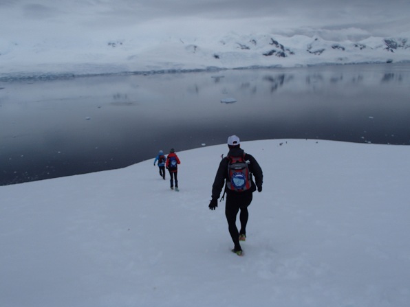 船は再び動き始めネコ湾の方角へ戻っていきダンコ島(Danko)に到着した。曇っているものの天候は穏やかになってきている。16時からブリーフィングがおこなわれ最終ステージ開催決定!これで南極に上陸してお別れすることができる。わずかに開催される望みを持ってウェアの準備もできている状態、テーピングもしっかりした状態でいたため、すぐにゾディアックに乗って17時ごろ上陸。午前中に比べれば相当ましな天気ではあるものの雪が少し降っているし風もあり寒い。今日はレインウェア上下を着て走ることにした。