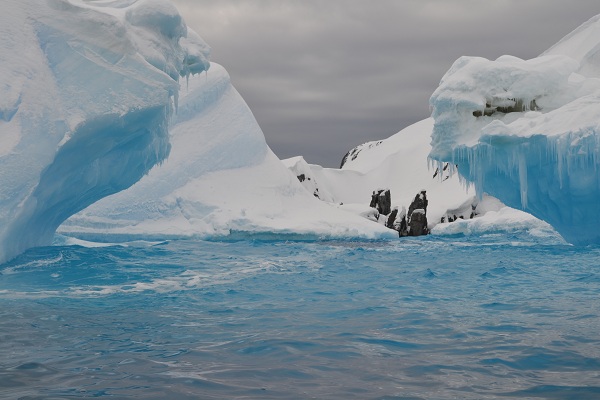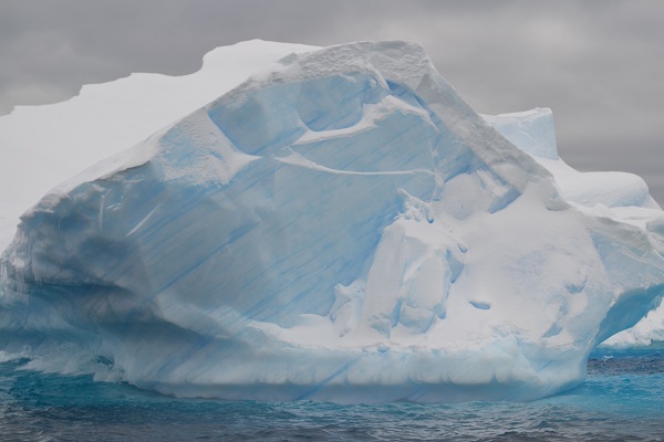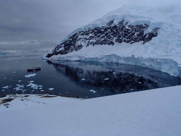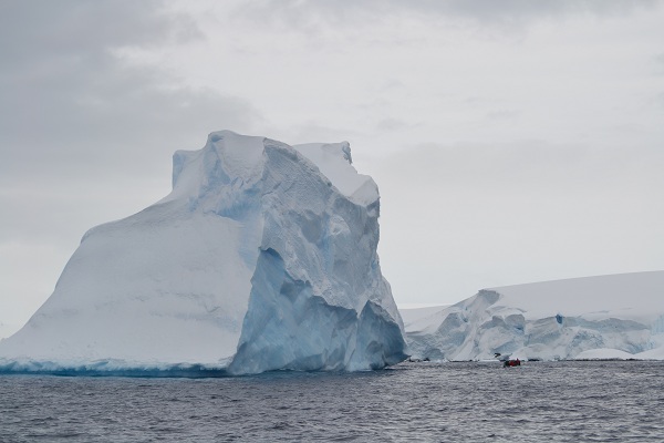 曇り空の下、氷山ツアー出発。南極に来てから最初の3日間は南極にしては珍しいという晴れに恵まれたが、それ以降は南極らしい?曇り空ばかりだったな。ゾディアックは氷山に近づいては止まりガイドさんが何やら説明をしていく。この辺りは岩場のような小さな島がたくさんたくさんあり陸地沿いに氷の壁やそこから剥がれ落ちた小さな氷が流れている。曇り空でも氷は青く光りゾディアックから水面の下の氷を見ると緑がかった青い色をしている。最初のうちは何が見れるかわくわくしていたが、何日も南極にいた後なので飽きてきた。ゾディアックに乗っていると風は寒いし揺れて疲れるため1時間経過したころには早く船に戻らないかなとばかり考えていた。船のほうに戻っていくときに今にもひっくり返りそうな感じにゆっくり大きく揺れている氷山を見た。9時40分にツアー終了。
