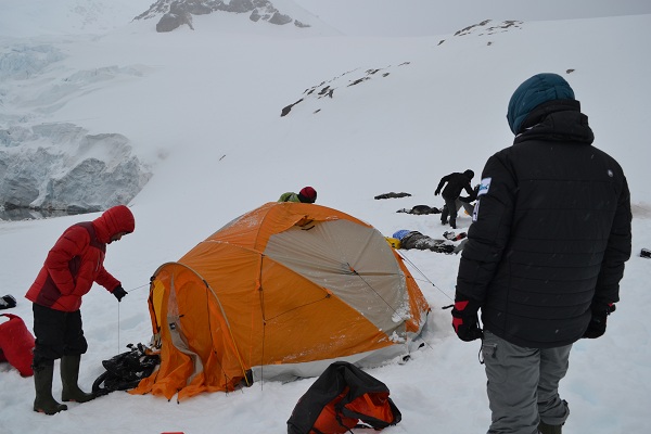 スタートになるベースキャンプは緩やかな坂の向こう側の少し窪んだところ。その向こうには急斜面の尾根がありレースのコースはそこを登っていくようだ。今日は少し風があるものの日差しが強く暖かく感じるため1日目よりも薄着で走ることにした。もちろん義務装備でもあるアウターのレインウェアはザックに入れていくのだが、スタート時には着用せず「ファイントラックメッシュ+ロングスリーブ(キャプリーン3)」という南極のイメージからすれば相当の薄着。しかし1日目のキングジョージ島では、この組み合わせの上にレインウェアを着ると向かい風区間以外では暑く感じ汗がたくさん出たため、しっかり走れていればアウターはいらないような気がする。シューズは雪が深いと読んでゴアテックスのトレイルランニングシューズ。初日の軽量重視のシューズよりも防寒・安定性に優れる。あまりに天気が良く景色も素晴らしいためか、今日はスタート前に選手&スタッフの集合写真撮影がおこなわれた。