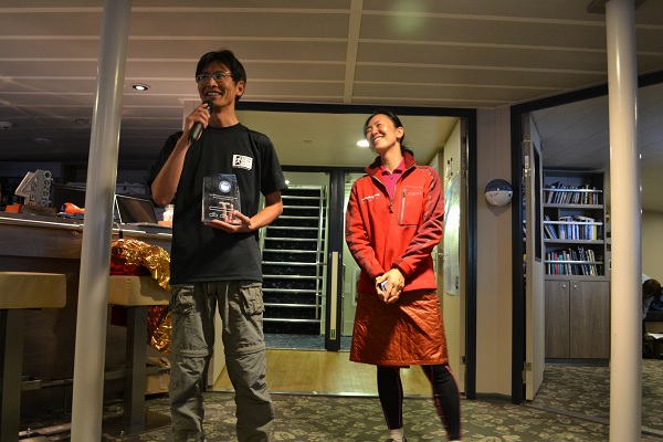 夜は表彰式。集まった選手たちの一部はエマージェンシーシートでドレスアップしている。金色と銀色できらきらしたエマージェンシーシートをドレスのように着ている。いよいよ入賞の楯をもらえるのかな?と期待は最高潮。もしかしたらコメントを求められるかもと不安も少々。まあなるようになるさ。男女の優勝者ビンセントとアンナ・マリーが表彰された次に突然名前を呼ばれた。優勝の次は2位ではなく3位を先に表彰するのか!?片手にカメラを持ったままなので誰かに撮ってもらおうと渡す相手を探すが日本人選手は後ろの方にいて見つからない。すると韓国のユニくんと目が合ったのでとっさにお願いとカメラを渡す。(ユニくんが写真撮ってくれました)