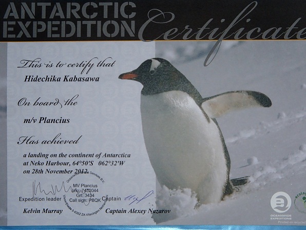 ドレーク海峡に入ったが海は穏やかでほとんど揺れない。酔い止めを飲んでいなくても全く問題なし。何もやることがなく暇過ぎる。夕方に南極上陸証明書をもらった。これは南極に行った観光船が発行してくれるもので名前・船名・上陸地・緯度経度・日付が入っている。上陸地はネコ湾で南緯64度50分。南極圏は1年のうちに太陽が全く昇らない、または沈まない日があるという定義で南緯66度33分よりも南のため今回は南極圏には入っていないことになる。