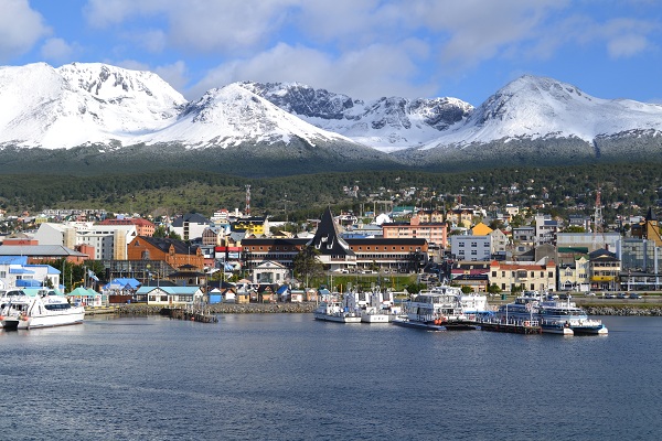朝起きるとすでに船はウシュアイア到着。朝食に行く前に船から降りる準備を済ませ大きな荷物(スーツケース)を部屋の外に出しておく。部屋のカギを受付に返してレストランで朝食。朝食の後すぐに船から下りれるのかと思っていたが、どこから降りるのか、降りてよいのかわからない。とりあえずラウンジやデッキをうろうろして外の様子を見る。ウシュアイアはすでに夏だが南極に行っている間にも雪が降ったようで、近くに見える山の中腹から上は真っ白に雪が積もっている。