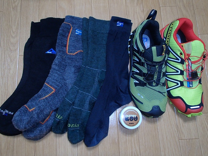 ソックスは完全防水のSealSkinzで行くか、濡れる前提でスキンメッシュソックス+トレッキングソックスで行くか