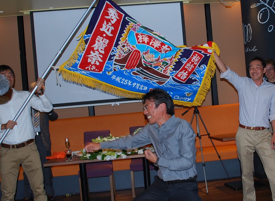 アドベンチャーレースチーム「ちゃりんこ Cherry」早川氏による祝福の舞と大漁旗贈呈。