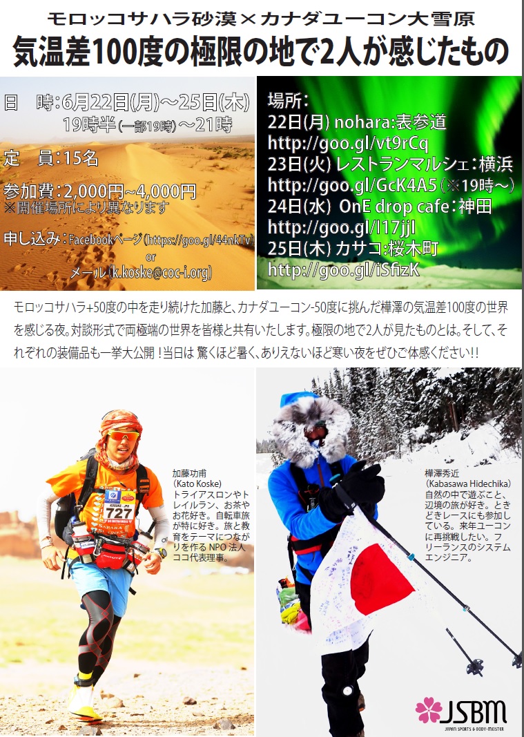 4月にサハラマラソンに出場したJSBM(日本スポーツ&ボディマイスター協会)加藤氏とお話会をすることになりました。6/22(月)~6/25(木)の夜に毎日異なる場所でおこないます。