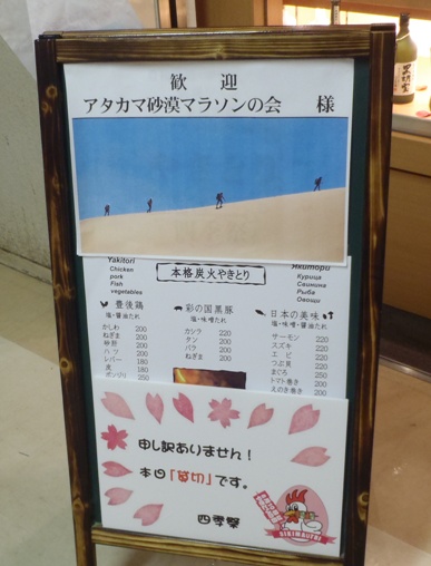 友人たちと新宿にある大きいテレビを見れるやきとり屋でアタカマのテレビ番組を観賞。お店は貸し切りで入口には「歓迎・アタカマ砂漠マラソン」と怪しい張り紙がされています。番組はアタカマのきれいな景色がいっぱいで素晴らしかったです。自分ばかり出ていたのがちょっと申し訳ないです。仲間に囲まれてこんな番組を見れるなんて幸せ者ですね。