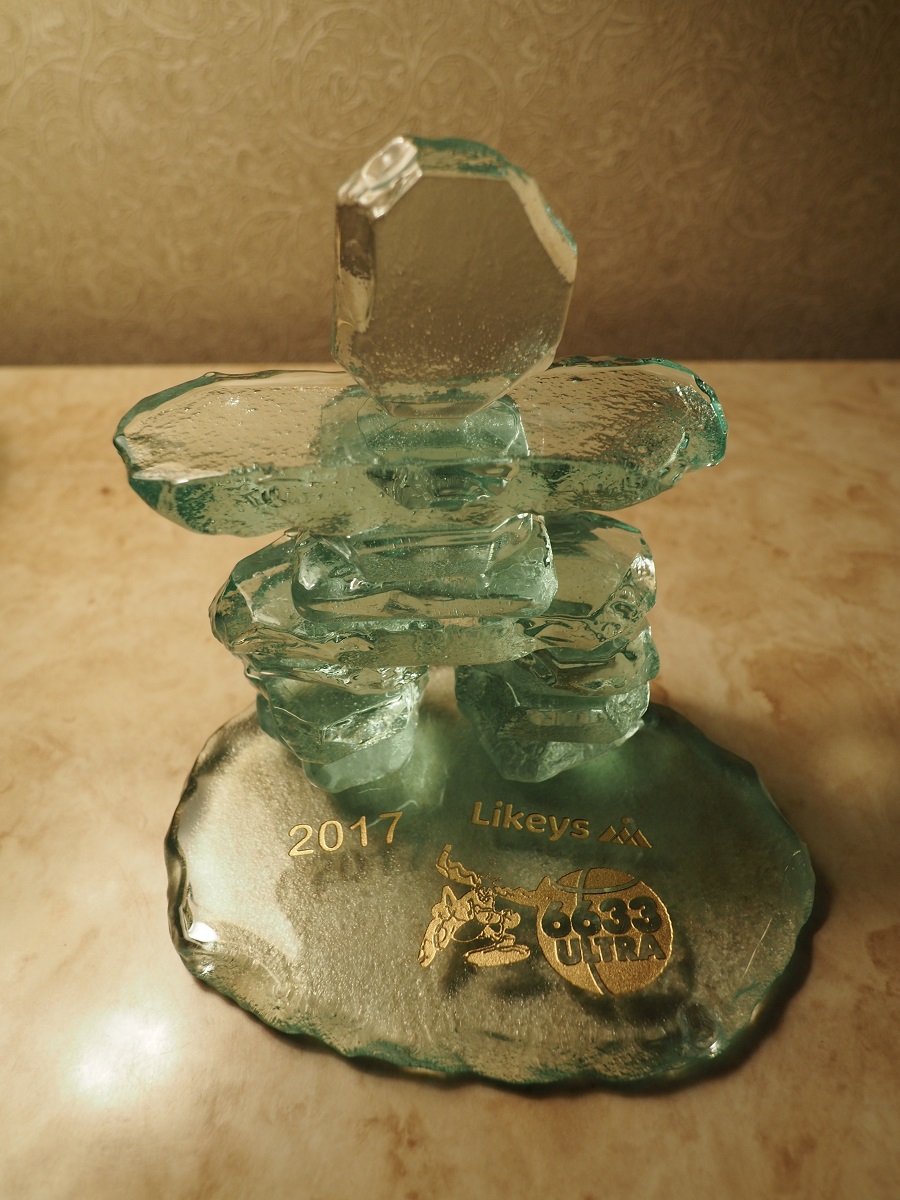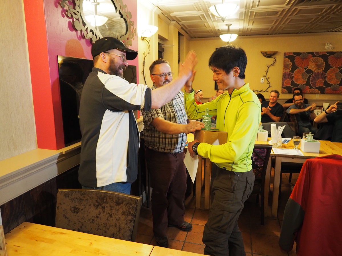 ホテルに戻って荷物整理とランドリーで洗濯を開始。ある程度きれいにして持ち帰り、帰ってからの手間を減らしたい。19時にレース閉会パーティのためハイカントリーインに行く。閉会式はそもそも参加者が少ないこともあってとてもアットホーム。完走していない人も、取材チームまですべての人に対して主催者マーティンがコメントをし表彰をしてしまうという自由さだった。イヌクシュクのオブジェも完走していない人ももらえる。優勝者はサイズが大きかったりはするが、なぜか出場者ですらない取材チームディレクターにもオブジェが贈呈されていた(笑)