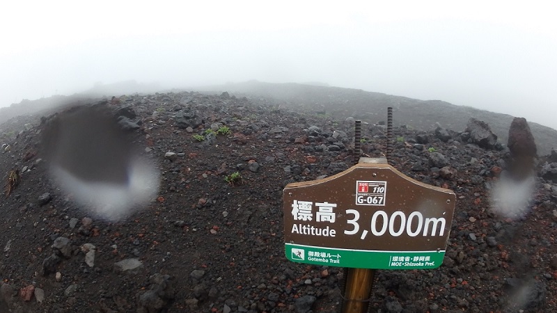 4区からの砂の登山道はストックを使う。さすがに体のあちこち痛くてペースは上がらずちょっと速い登山くらいのペース。5区に入ったところで太郎坊(4区)スタートの出島さんが降りてきた。雨・風が強く寒いので新6合で折り返してきたという。自分も区切りのいい目印があるところで折り返しにしようと思って先に進む。新6合ではまだあまり寒さや危険は感じなかったので行けるところまで進むことにする。標高3090mの砂走館まで行ってしまった(5区完走)。