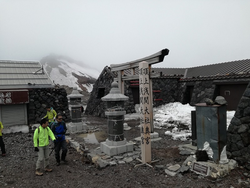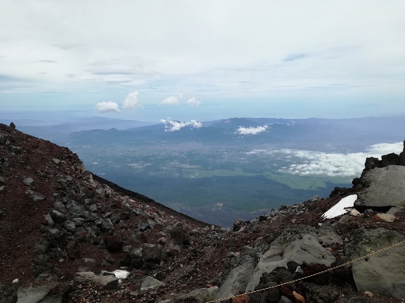5区の後半から風が強く寒かった。前半は暑くて風吹かないかなと思っていたくらいだったのだが。7合目の砂走館(標高3090m)で終わりにしようか考えたが、少しだけ行ってみることにしてレインウェアの上着を着てスタート。5区まではまあまあ集中して歩きとおしたので疲労がたまっていて体も冷えているし早々にだめな感じだった。それでも赤岩8合で駅伝で走るときの5分遅れくらいだったのでもう少し行けるかもしれないと素通り。さらに標高が上がると風で巻き上げられた小さな石がときどき降り注ぐようになった。グローブを持ってきていなかったので手が冷たくなり感覚が鈍くなっていく。レインウェアの中に手を引っ込めるが区切りのいいところで引き返そうと思った。確か標高の書かれた案内板が出ていたはず・・・と思ったのだが、登山道が正式にオープンしていないためか案内板がまったくない。上のほうで登山道がまだ雪渓に埋まっている場所が一部あり解けかけた雪に埋まりながら、または雪の脇に登山道を外れて進む。ただ雪を避けて登山道を外れると自分が落石を発生させそうで危険だった。引き返そうと思っていた案内板はなく、どうしようか考えているうちに山頂まで行ってしまった。富士山に行くと決めたときは山頂まで行ってお鉢巡りを何周かしようと思っていたくらいだったが、長時間滞在するのは今日の自分のウエアでは無理だったのでさっさと下山。しかしグローブを持っていればもう少しきちんと登れたかもしれない。山頂で撮った写真は自分の指がボタンを押す感覚がないくらい冷えていた。