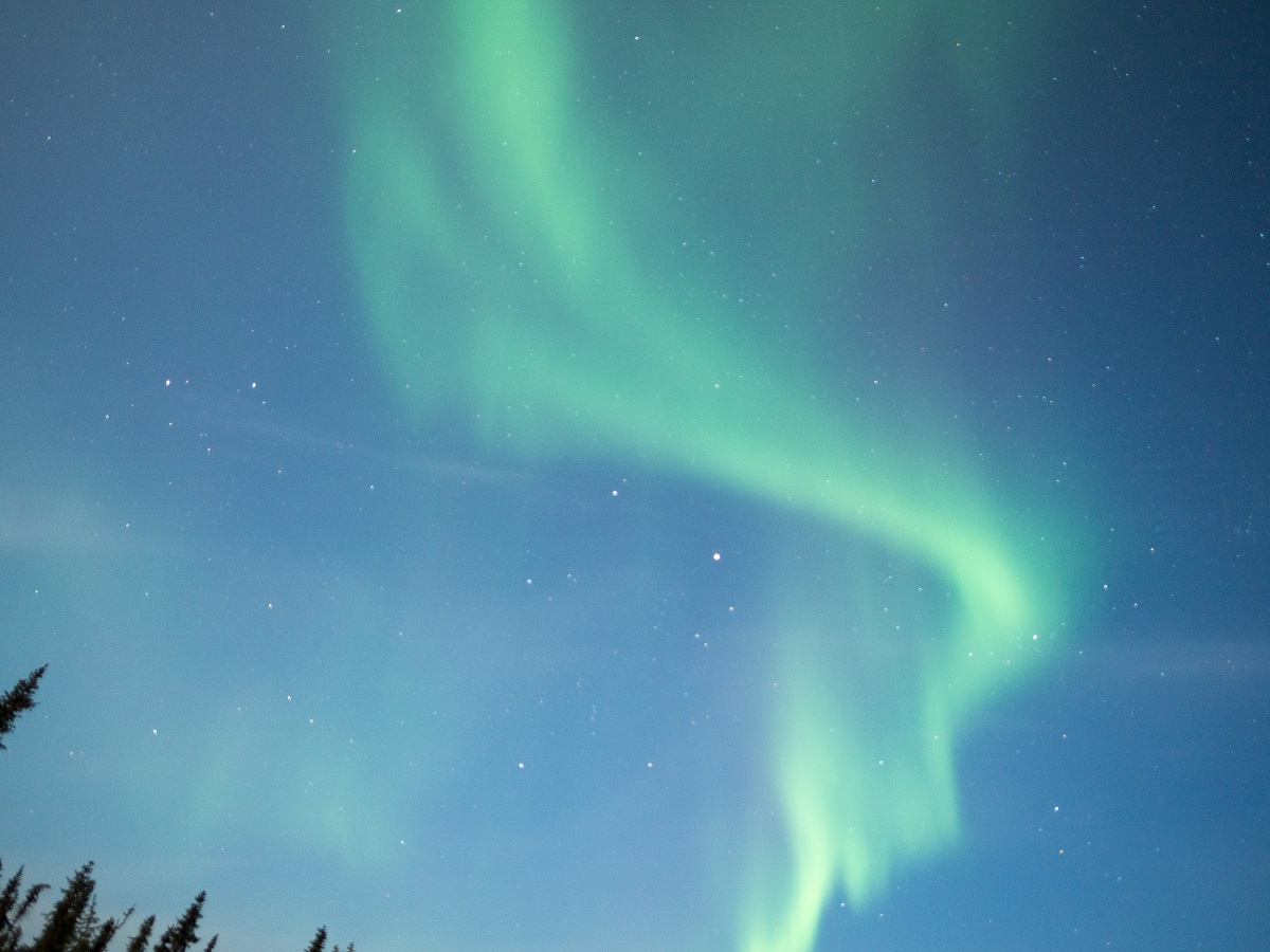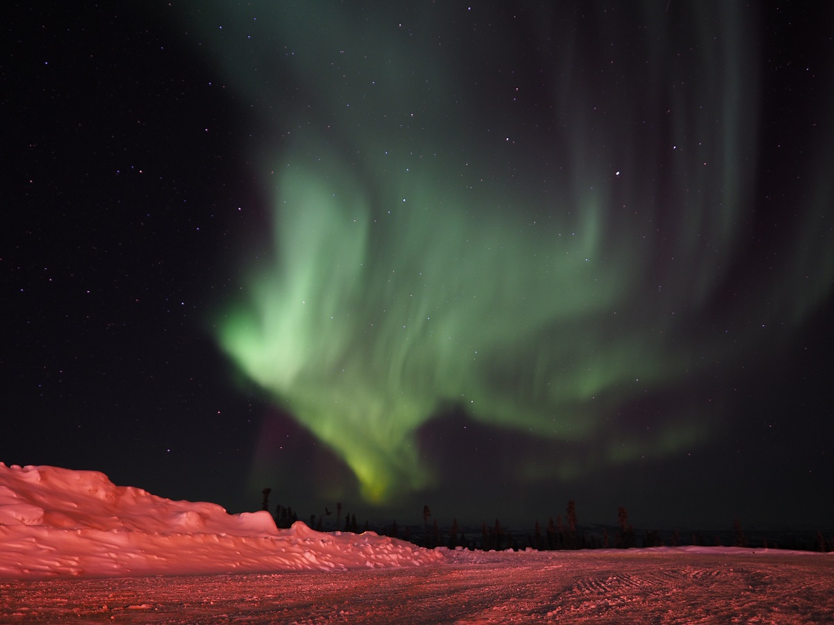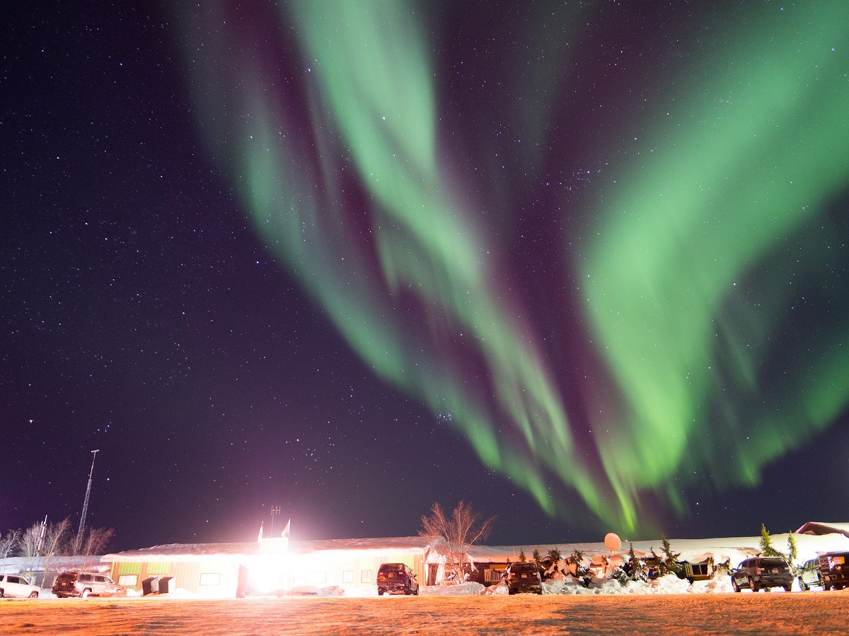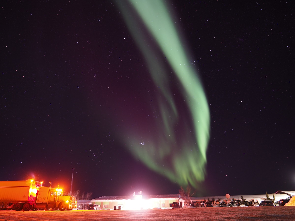 夜一度は早めにベッドに入ったが夜中に目が覚めたので窓の外を見るとオーロラが出ている。外に撮影に出るとオーロラはどんどん強くなりかなり迫力あり。少しの間撮影して体とデジカメを温めるために一度部屋に戻る。松村さんは寝ていたがせっかくの強いオーロラなので「オーロラがすごいです」と起こす。レース中にはできなかった撮影条件を変えながらの撮影など試し、もう一度部屋に戻って温まってから外に出るとオーロラは消えてしまっていた。それにしてもレースを完走できて、これできれいなオーロラの写真も撮れたのでかなり満足だ。