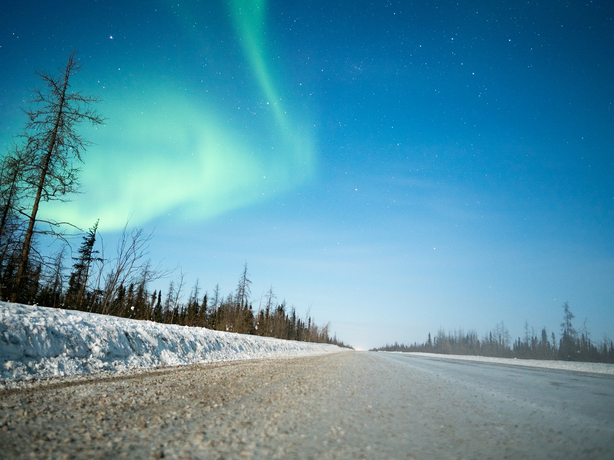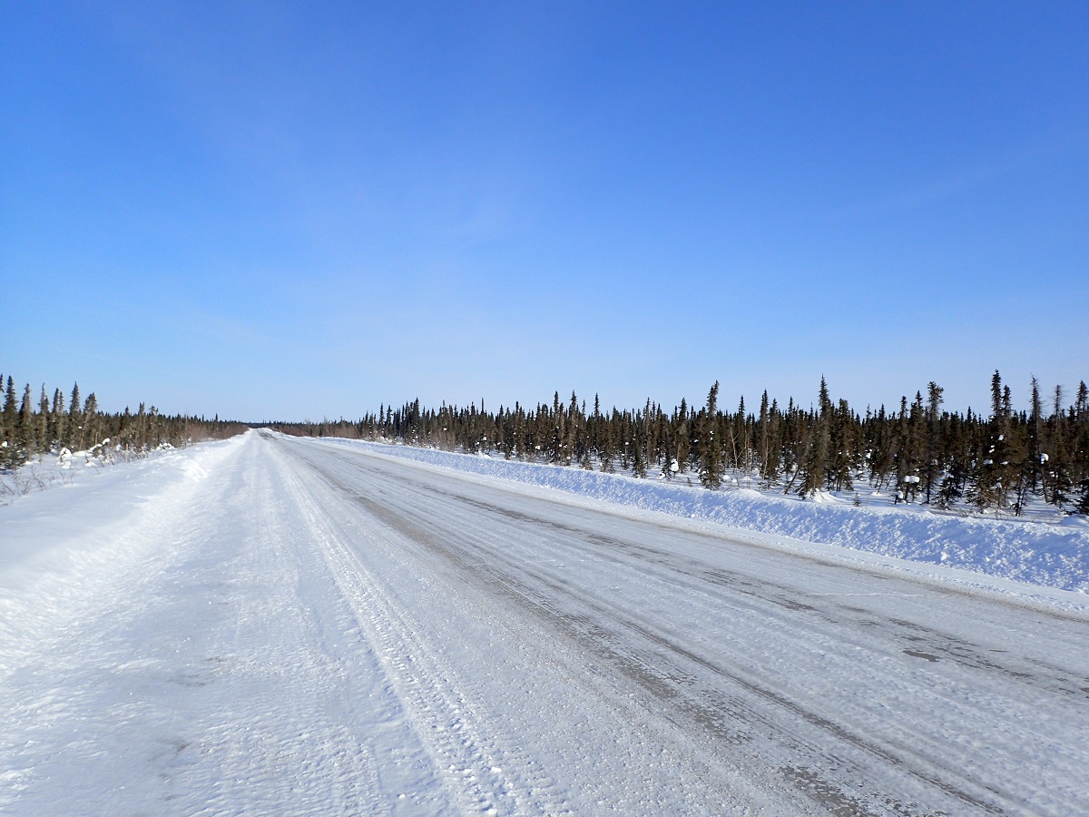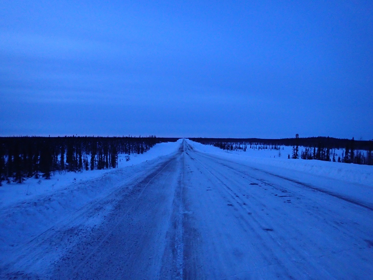 ツィーゲーチックを出ると「WARNING Athletes on the road ahead」と看板が出ている。「道にアスリートがいるから気を付けろ」って意味がわからない(笑)ひたすらまっすぐな道(40~50kmまっすぐ!)。遠くに車のライトが見えてから来るまで15分くらいはある気がする。時々前後を確認していれば道の端ではなく雪が固くて進みやすい場所を歩いていて大丈夫。ヘッドライトが2つに見えるようになったら端に避けるようにしていた。きれいなオーロラが現れた。オーロラの撮影チャンスに備えポケットで温めていたOMDの電池をOMDに入れ道路にミニ三脚を設置して撮影する。適当に数枚撮ってあとは我慢。いちいち撮っているときりがない。空を見上げると北の空高いところにカシオペア。北極星はほとんど天頂に近いところに見える。北斗七星は北の空ではなく南の空高くという感じ。星の動きは東から昇ってくるのではなく水平に回転している感じになる。気温が冷え込んでくる。マイナス30度。まっすぐな道が数十キロ続き道の両側は除雪で1mほどの壁。ビバークする場所がないため壁の奥側に木が生えているところで壁の上に乗り、ソリが向こう側に滑っていかないように木にくっつけて置いてその上で寝る。肩と頭の部分はソリに積んだ荷物のバッグを置く。