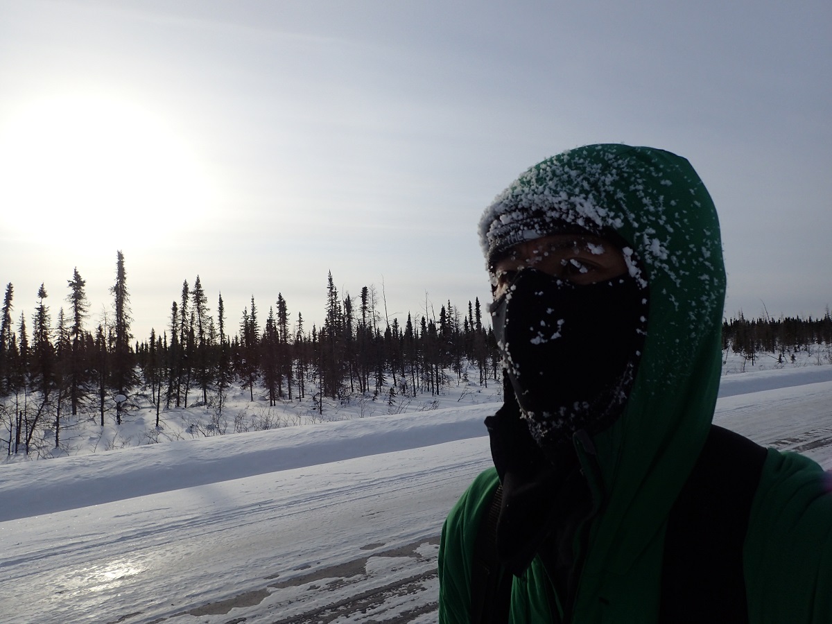朝が近づくにつれて急激に寒さを感じるようになった。体は滅多なことでは寒いとは感じないが、手足、顔がきつい。この寒さは何?と思って温度計を見るとマイナス37度で今回のレース中一番の冷え。まだ夜明けまで時間があるのでもう少し下がるかもしれない。顔は風を受けないように下向き、地面についた先を行く選手の足跡と車のタイヤ跡を追う、ときどき顔を上げて進行方向を確認。手はオーバーグローブの内側で汗が凍って氷ができている(ビニール手袋節約でベイパーバリアしていないので)。アウター(DASパーカー)のポケットに手を突っ込んで歩くとましな感じになった。足の冷えは今回のレース初のオーバーシューズ。効果を確かめる意味と、ソックス2重履きやベイパーバリアをするには一度シューズを脱がなければならず面倒。ついでにメインで着用しているバラクラバは湿って(凍って)いるので新しいバラクラバを着ける。なんとか進み続けるがペースは上がらないしリスクも高いので、つい目はビバークできる場所を探してしまう。シュラフに退避したい気持ちが強くなる。しかし制限時間に対して余裕があるわけではないし、カリブークリークでしっかり寝てきたので、ここで停滞するわけにもいかない。明るくなれば気持ちも上向いてくると信じて前進あるのみ。