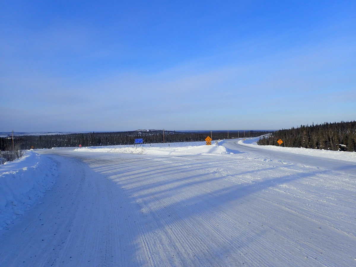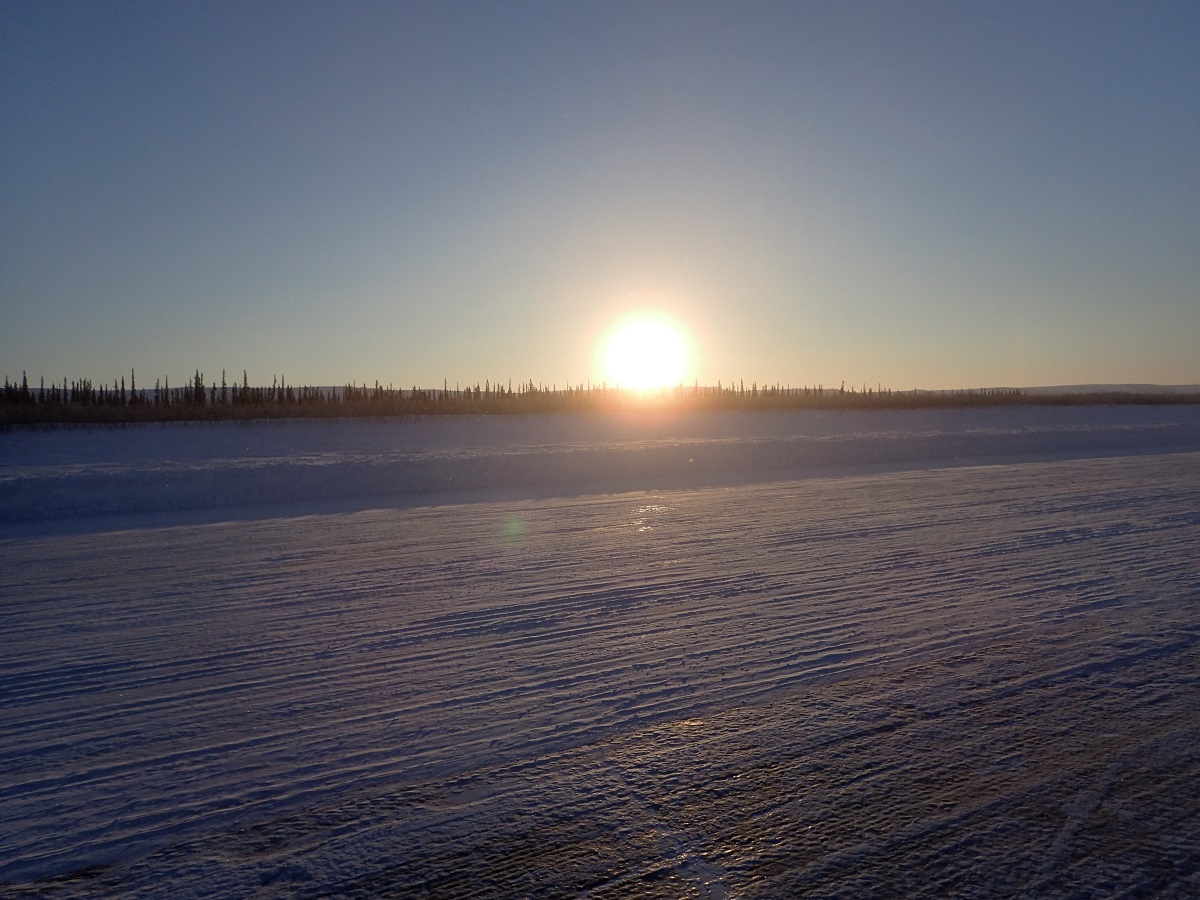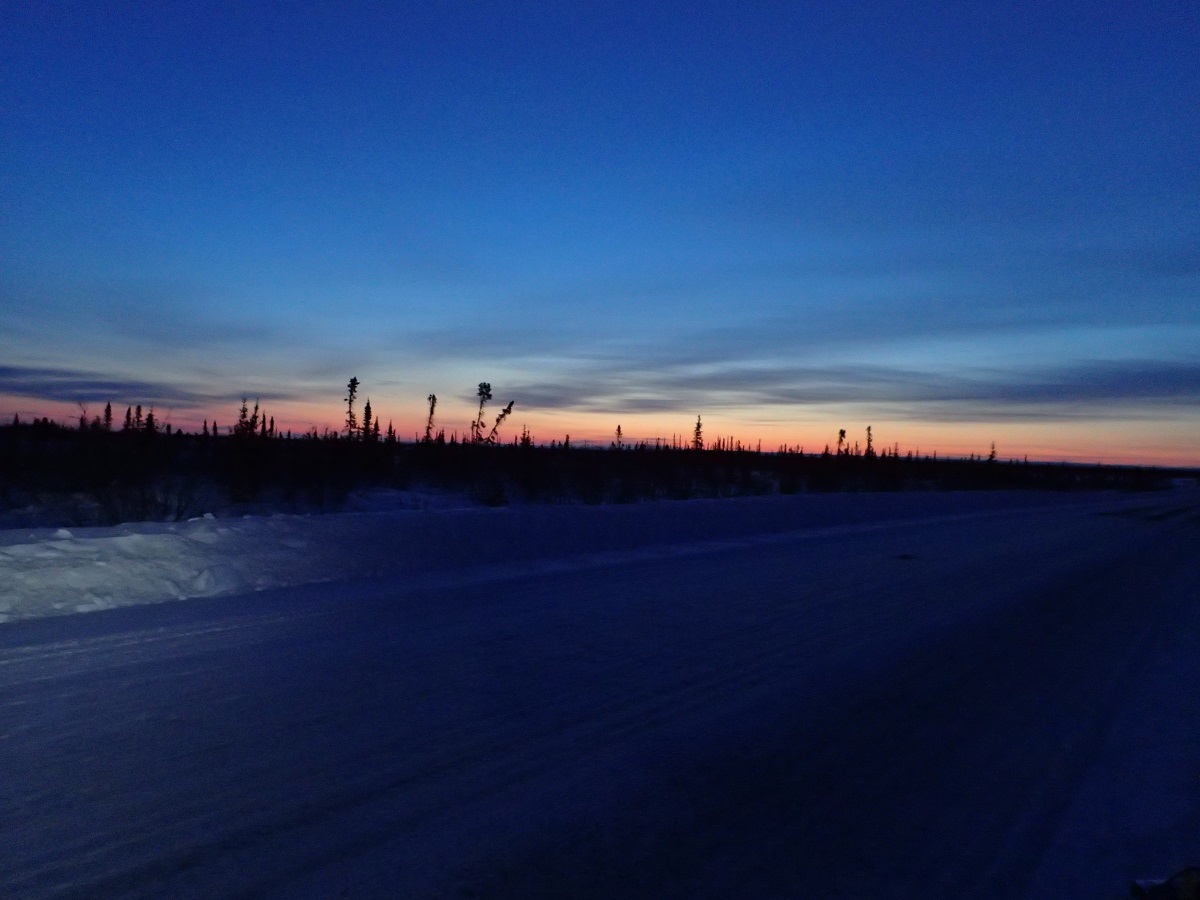 2度目の睡眠は明るくなってから道にカーブが現れ始めたところで除雪の壁がない広い路肩で寝る。真夜中はほとんど車(トレーラー)が来ないが明るくなると車が来るようになるため明るくなる前に寝る場所を決めれるとよかった。日中は変化に乏しい道をひたすら歩く。この区間は82kmといつもより10kmくらい長いので行動時間が2~3時間長くなる。きれいな夕日を見ながらカリブークリークの近くまできた。夕日といっても太陽が低い位置にあるだけでここからなかなか沈まないのだが。道の左側に大会スタッフっぽい車が止まっているが人はいなく建物もない。前のCPでは分岐でスタッフが待っていて「ついてこい」だったので、誰もいないということは違うのかもと思い先へ進む。先のほうにもキャンプ場っぽい看板が出ていたりする。