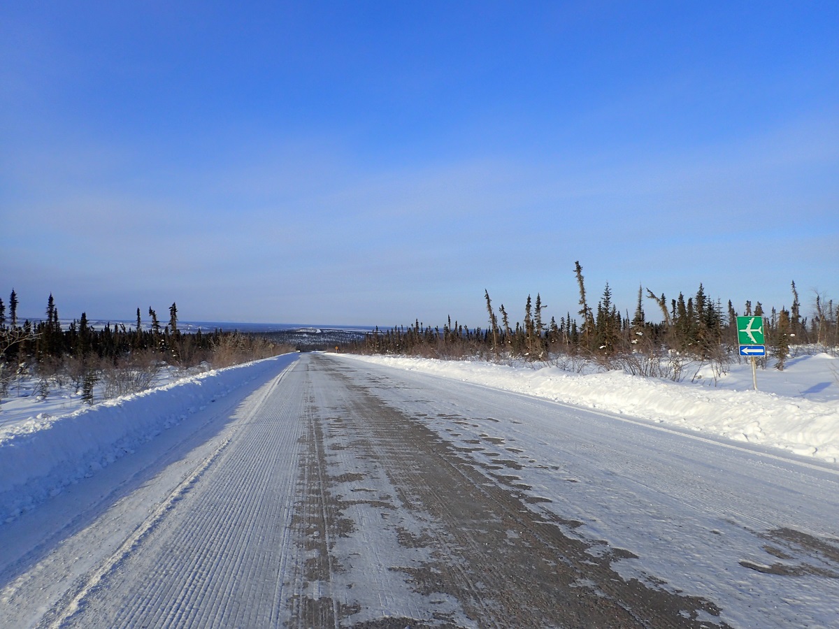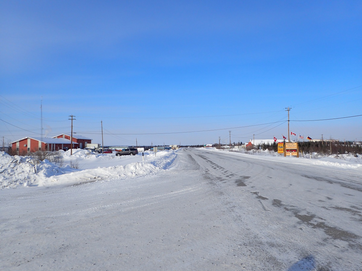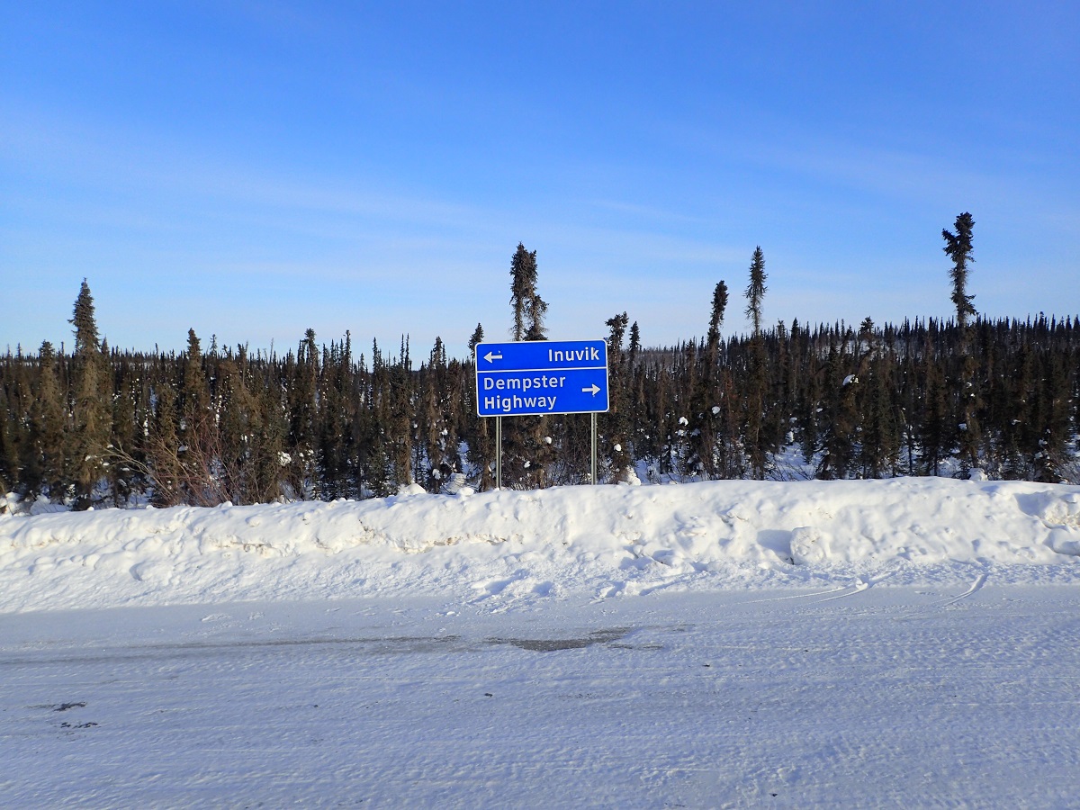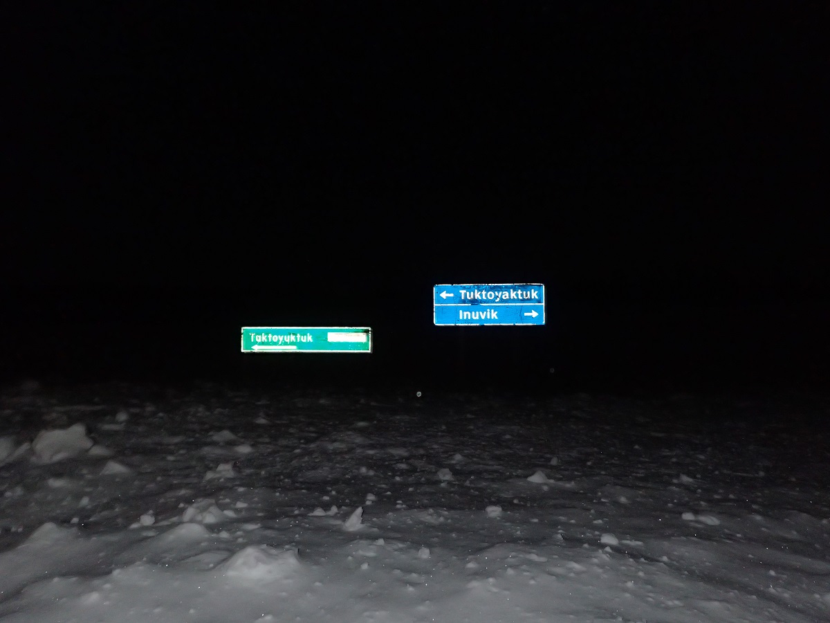 明るくなったらやっぱり体がよく動くようになってきた。明け方は強く朝を待ち望んでいたためか、朝焼けがとてもきれいに感じた。GPSを確認するとスローペースながら動き続けたのは意味があって思ったよりも前進していた。もともとこの区間の距離は短いからというのもあるけれど。ピンチを脱して足取りも軽くなって進んでいくと空港があった。空港があるのはイヌビックについた証拠。大きな三叉路は空港、イヌビック、デンプスターハイウェイの分岐で来た方向に向かって矢印でデンプスターハイウェイと書かれているのが、ようやくデンプスターハイウェイの終点まで来たんだなという実感を与えてくれる。