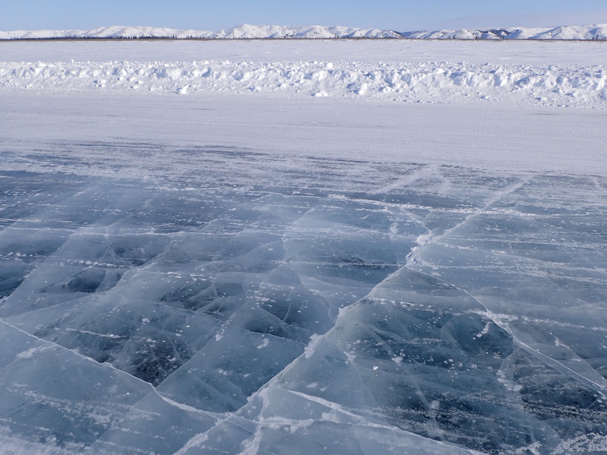 3時間経過後は体と相談しながら、ずっと時計をチェックしているのも大変なので適当に走りを入れる。それでもだんだん歩きが多くなってきた。明け方にスコット選手を抜かした。ビバークをしていたのか出発の準備をしている。この後、夕方までずっと抜きつ抜かれつを繰り返すことになる。夜の間はあまりはっきり見えていなかったアイスロードだが明るくなり北へ進むほど透き通った氷の道という感じになってきた。まさに見たかったそして歩きたかった風景。後ろから大会スタッフの車が来たと思ったら松村さんが車から降りて撮影している。リタイアしても大会スタッフと一緒に観光っぽく移動して楽しめているようだった。写真を撮って遊んでいたらマーティンに「ヒデチカ、急げ!」と言われてしまった。