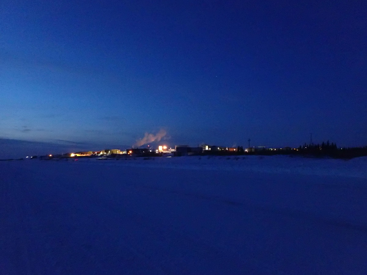 このあたりもアイスロードだがこれまでと違いひび割れが大きく、ときどき足がはまって転びそうになったりソリのタイヤが落ちたりする。空にはオーロラ。まっ暗なアイスロードを進んでいると、地面のタイヤ跡、氷のひび割れ、道の曲がり具合(道が交差しているように見えたところもあったが一本道のはず)同じ場所を何度も通っているような気がして「自分はもしかして同じ場所をぐるぐるしているのか?」という錯覚に陥る。前方に見えている街明かりも見え方はまったく変わらず。本当に街の明かりを見ているのか信じられなくなってくる。GPSを確認するとあと10kmちょっとのはず。