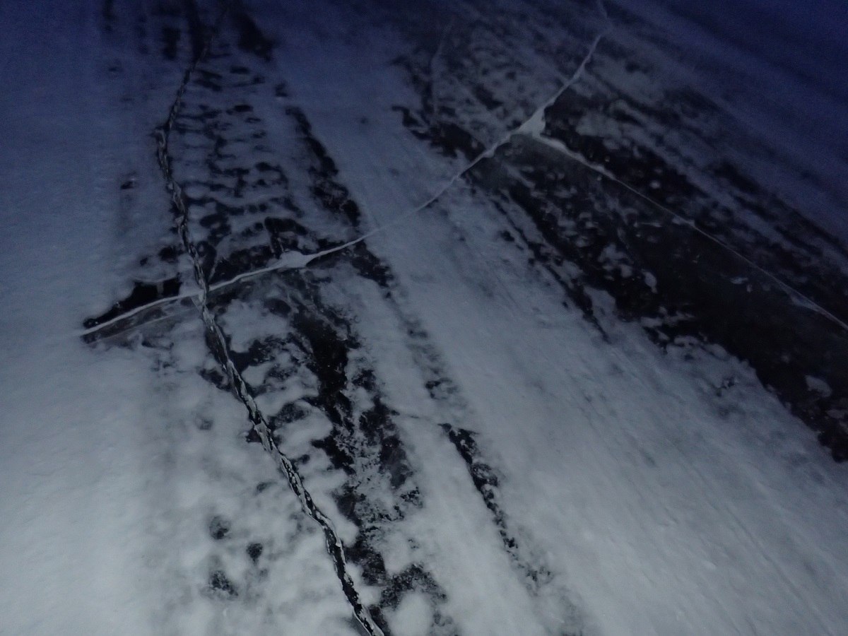 昼から夜への切り替わりはウェアを追加で着たり(DASパーカー、DASパンツを上に着る)、ソックスが湿っていれば履き替えたり、明るいうちにお湯を使う食事を済ませて必要な行動食を手元のバッグに補充したりやることが多い。手袋を外してまとめておこなうと手が冷え切ってしまうため、作業して行動して温めての繰り返しをしながら夜を迎える準備が整っていく。暗くなるとさすがに眠気が押し寄せてきた。頭の中も「次のCPはまだ見えないのか?」でいっぱいになってしまう。ふと足元を見ると建設現場か資材置き場のように金属のパイプとも角材とも見えるような長いものがごろごろと転がっている。なんでこんなものがあるんだ?とまたいで通行するが、しばらくしてこれは氷の下にあるものが浮かび上がって見えているのでは?と思い、またがずに踏みつけてみると平らな氷の感触。昼間は透明な氷にしか見えなかったのに夜になると川の中にあるものが浮かび上がって見えるなんて不思議だなーと写真を撮る(この写真をレポート書きながら確認してまたびっくり。普通のアイスロードが写っていて正体を見たと思っていたものもまだ幻覚だった)。細い木の枝に見えるものは氷のひび割れだった。